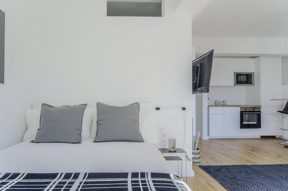 Beautiful and modernly designed studio that is sure to meet your expectations! This 30m2 studio will offer you everything you need for comfortable and modern living. Particularly worth mentioning is the large south-facing balcony at the back! This invites you to linger comfortably. Thanks to the intelligent design of the apartment, every square meter is used efficiently. The apartment has a flat-screen TV in the living room and the adjacent bedroom directly in front of the bed. The kitchenette comes with a dishwasher, an oven, a 4-ring ceramic hob, an integrated fridge-freezer, a microwave, a coffee machine, a kettle, a toaster,...