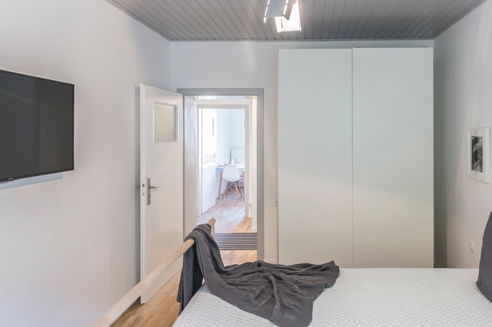 This fully furnished apartment has everything you need. Furnished living in Düsseldorf at a high level! The apartment was completely renovated in 2016 with a new oak parquet throughout the living room, a new kitchen, a new bathroom, gas heating, etc. In the kitchen, you will find, among other things, a Senseo coffee machine, a kettle, a large fridge-freezer, and a dining table with seating for up to four Persons. The bedroom has a 160 cm double bed, and a Smart TV, and the window can be darkened with a pleated blind if desired. The stated rental price refers to occupancy by one...