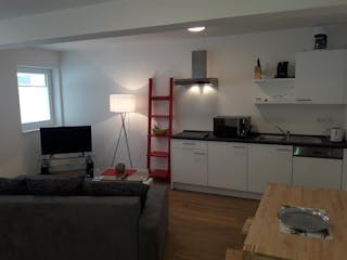 Die Wohnung befindet sich als Erdgeschosslage mit separatem Eingang in einem Innenhof. Ebenso hat die Wohnung eine Terrasse zur eigenen Nutzung. Damit ist ein besonders ruhiges behagliches Wohnen möglich. Der Wohnraum ist als Wohn-/Essraum mit Küchenzeile gestaltet. Das Schlafzimmer ist hell und mit einem Doppelbett ausgestattet. Plissees sorgen am Abend für die notwendige Abgeschiedenheit. Das Bad verfügt über eine Dusche und ist in moderner Glasoptik gehalten. Waschmaschine und Trockner sind vorhanden. Es wird ein kostenfreies Wlan zur Verfügung gestellt. The apartment is located on the ground floor in the court yard, with a separate entrance. The apartment has its own terrace...