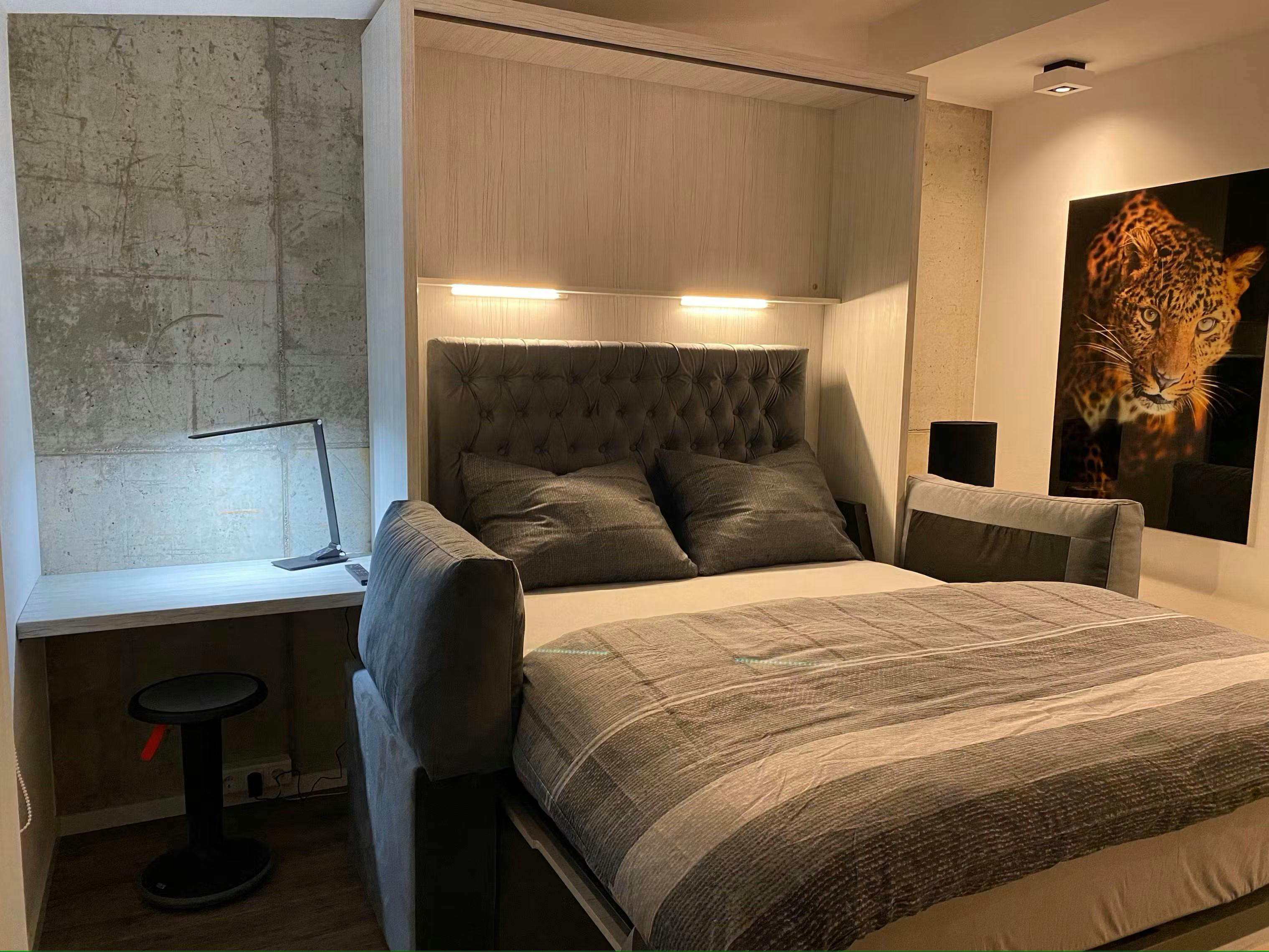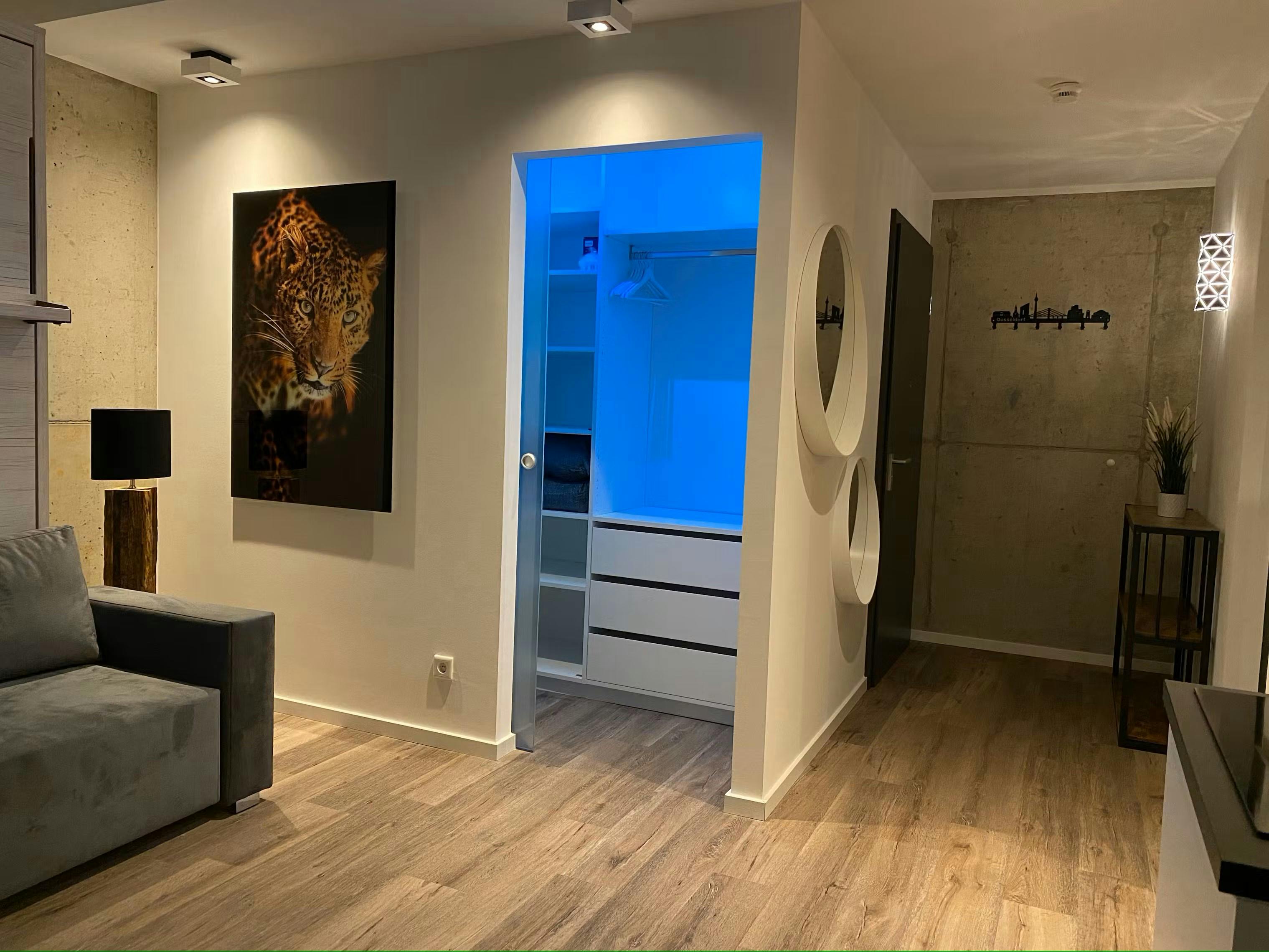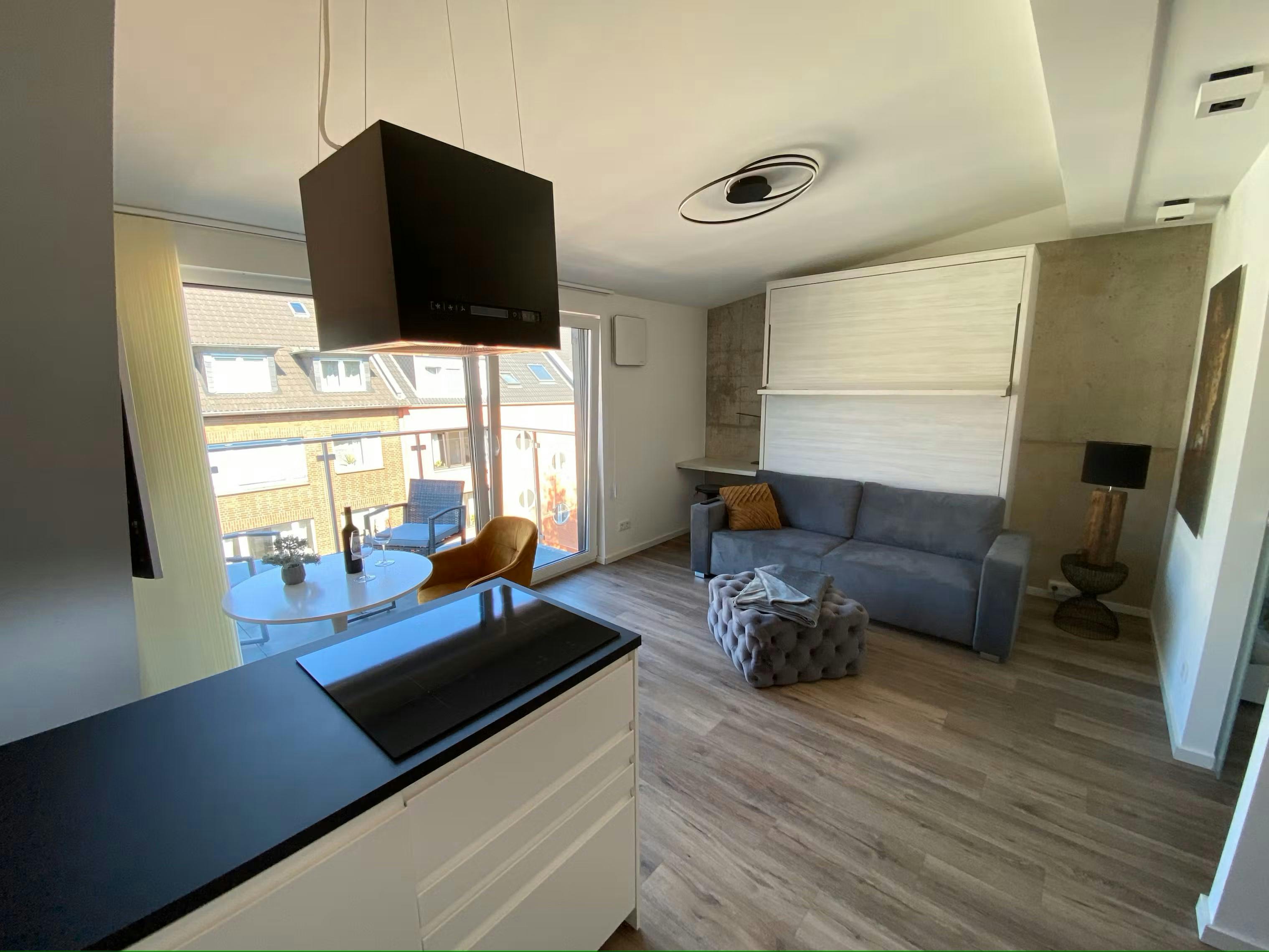 ENGLISH – For German see below This 33 m2, recently newly built and exclusively furnished flat with balcony and design fittings is in a prime location in Düsseldorf Bilk. The flat on the 5th floor can be reached comfortably via a lift and offers a fantastic view of the lively Brunnenstrasse all the way to the bustling Bilker Arcaden. In addition, the rising sun can be enjoyed wonderfully until midday under the open sky on the uncovered balcony on the last floor. The kitchen is equipped with high-quality brand-name appliances: 4-burner induction hob, dishwasher, microwave with oven function, capsule coffee machine,...