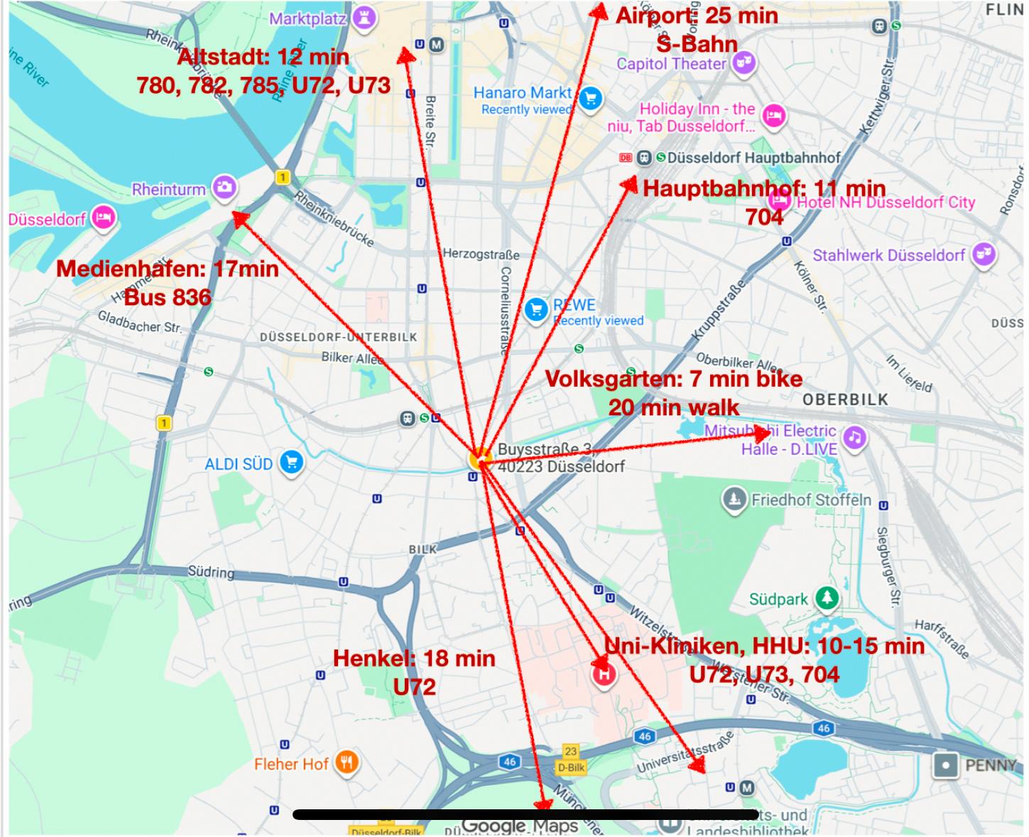 Modern Studio in the Heart of Bilk – Prime Location & Fully Furnished Looking for a stylish, "plug-and-play" home in one of Düsseldorf’s most vibrant neighborhoods? This 42m2 first-floor apartment on Buysstraße 3 offers the perfect blend of modern comfort and unbeatable urban connectivity. ? Location, Location, Location Living at Buysstraße 3 means having the best of Düsseldorf right at your doorstep. Whether you are a professional, a student, or a frequent traveler, your commute just got significantly shorter: • Volksgarten Park: Just a 7-minute bike ride or a 20-minute stroll for your morning jog or weekend relaxation. • University (HHU) & Clinics: Only 10–15...
